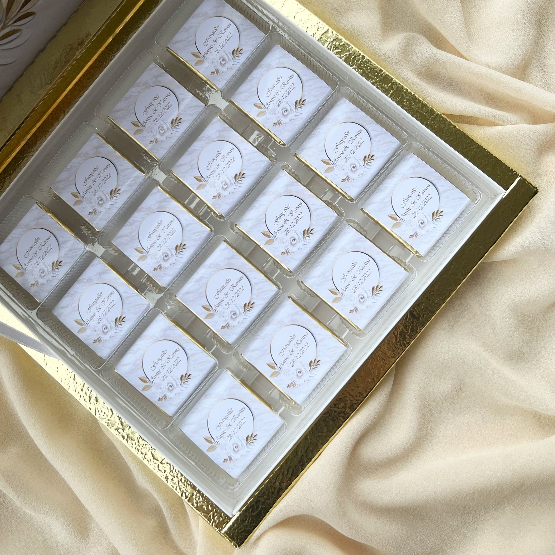 Composez le message et le thème de votre choix avec nos petits carrés de chocolat afin de créer votre boîte de chocolats personnalisée. Un cadeau gourmand & unique !