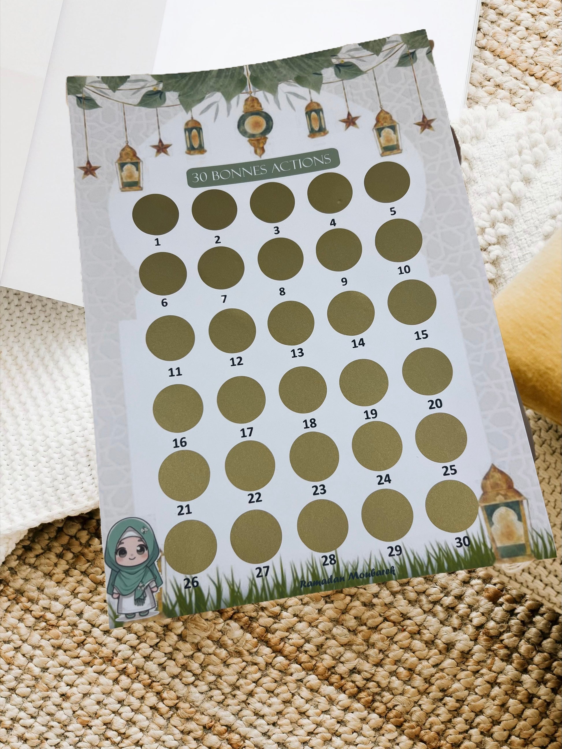 Calendrier Ramadan Enfant 2025 – Bonnes actions à gratter Ce calendrier de bonnes actions est à utiliser pendant le Ramadan. Il est utilisé pour réaliser de belles oeuvres pendant le mois béni du Ramadan.