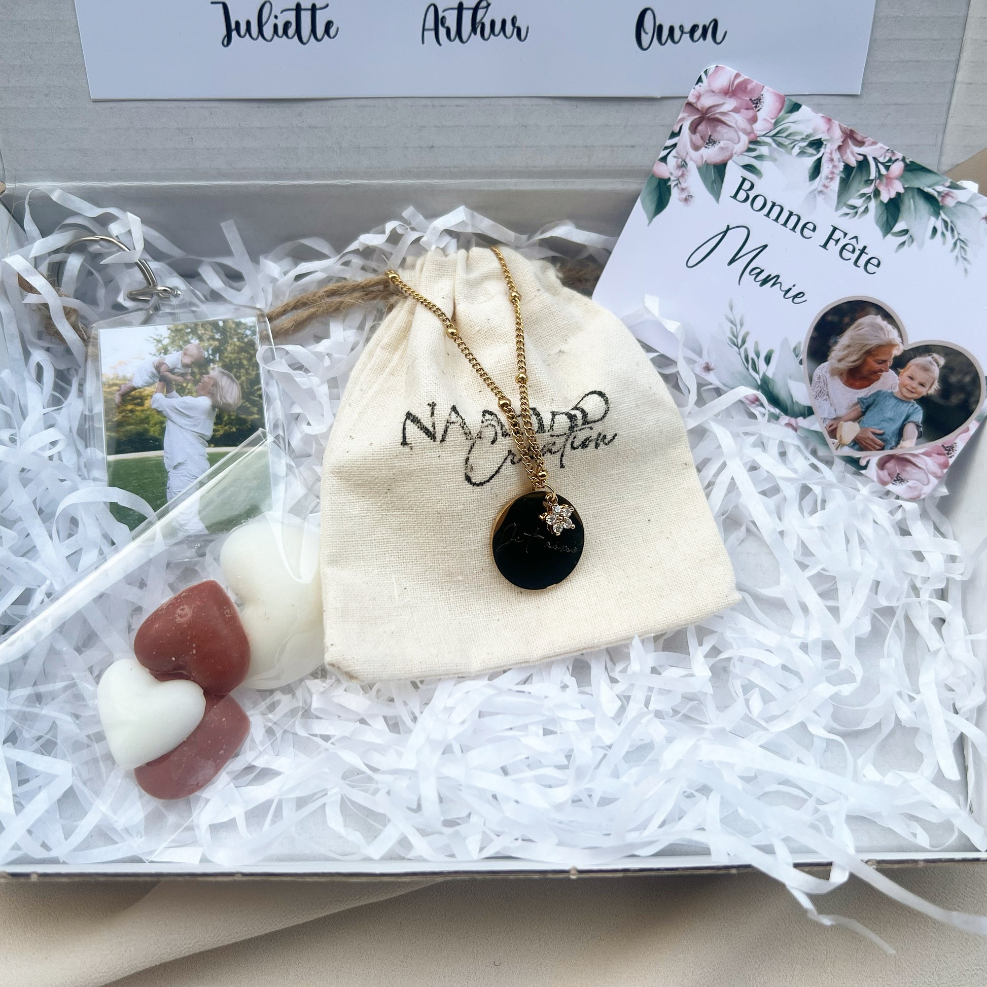 Ce coffret fête des grands-mères est parfait pour célébrer cette journée spéciale. Il comprend un collier personnalisés avec le message de votre choix ( pas plus de 12 lettres ) , un porte clés personnalisés avec deux photos de votre choix ( envoie par mail) et des fondants parfumés pour le linge .