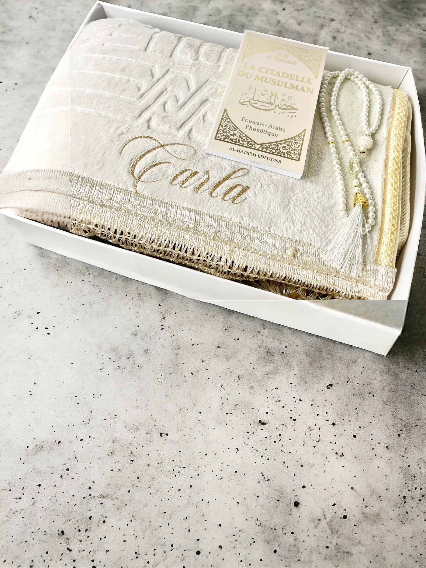 Tapis de prière personnalisé Ce tapis de prière personnalisé est le cadeau parfait pour les amis et la famille. Avec sa boîte personnalisée, ce tapis de prière est une façon unique de montrer votre amour et votre appréciation. Offrez à vos proches un cadeau qu'ils pourront utiliser lors de leurs moments de prière quotidienne.